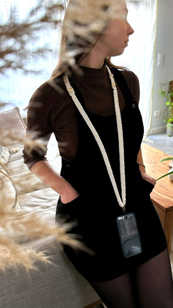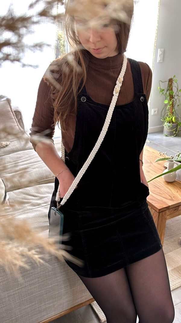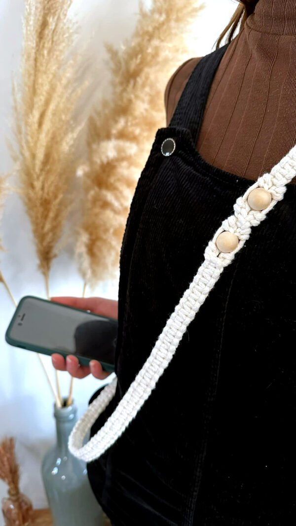 Sangle de téléphone réalisée en macramé. Elle apportera une touche bohème et naturelle à votre téléphone.